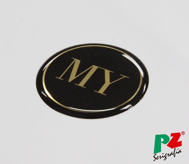 Stickers resinados sobre vinilo oro con impresión serigrafía