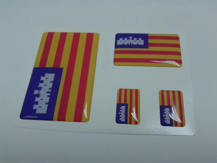Pegatinas con gota de resina sobre vinilo blanco permamante con la bandera de baleares