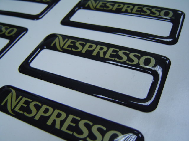 Pegatinas con gota de resina sobre vinilo blanco permamante con impresión digital con plotter de ecosolvente, el mismo plotter las troquela, posterior pegado sobre una placa con abertura para el nombre y colocación de pinza para ropa