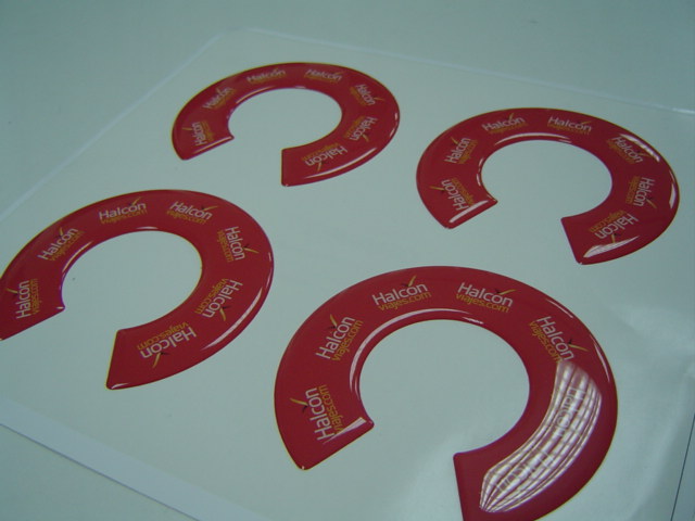 Pegatinas con gota de resina sobre vinilo blanco permamante con impresion y corte en plotter ecosolvente para publicidad en hoyos de golf