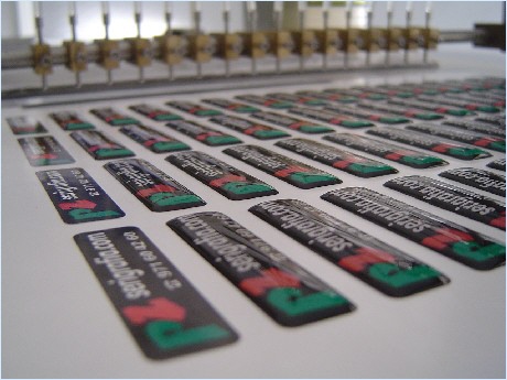 Pegatinas con gota de resina sobre vinilo blanco permamante impresas con serigrafía sobre vinilo negro